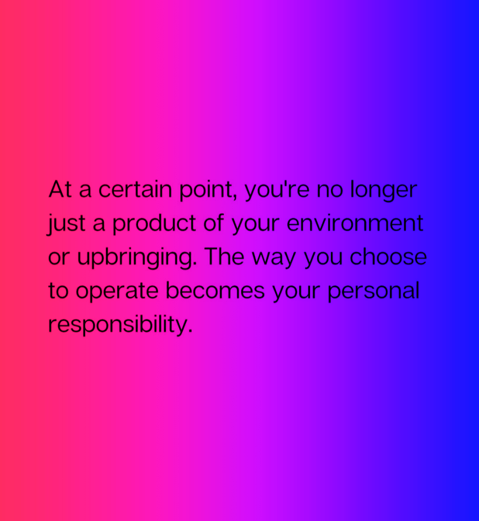 Eckhart Tolle’s quote highlights an important truth: while our upbringing and experiences shape us, they don’t have to define us forever. At some point, we have the power to take control of our actions and responses, making them our own responsibility.